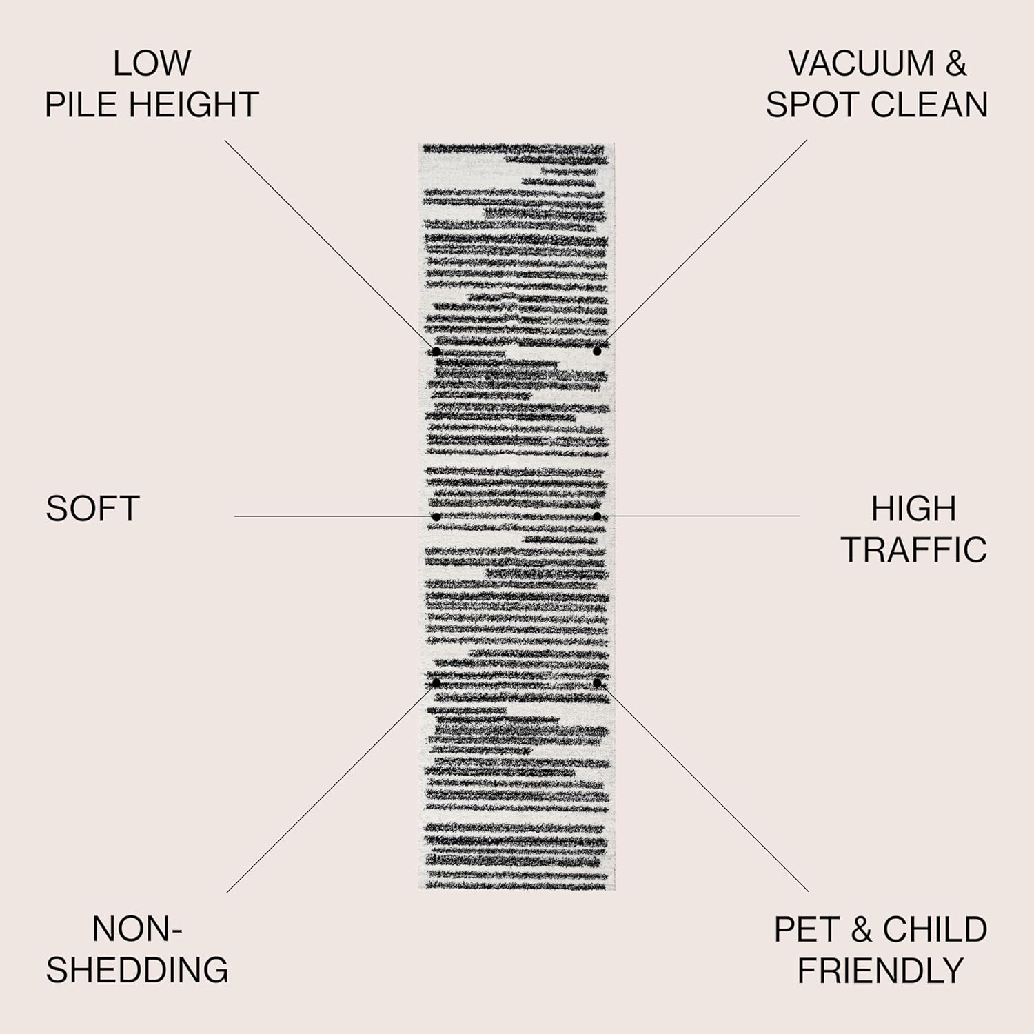 Elevate your hallway, entryway, or living space with this stylish 2x8 runner rug. Featuring a modern black and white striped pattern on a soft, neutral background, this rug brings a contemporary touch to any décor. Crafted with durable, easy-to-clean materials, it’s designed to withstand everyday foot traffic while maintaining its fresh look. The low-pile texture makes it perfect for high-traffic areas, fitting seamlessly under furniture or doors.